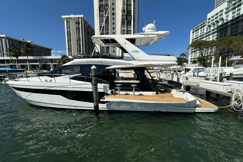 Loaded and 100% turnkey this exceptionally clean Galeon 500FLY 2019 is for you! Only 382 hours on her twin inboard Volvo Penta D11 diesel engines. Gorgeous color combination with the Black Walnut high gloss paired with the misty wood floor. In addition, she has full Raymarine electronics including chart plotters, radar, autopilot, AIS, VHF, Satellite TV and more. Your floating oasis is extremely comfortable with a Seakeeper 6 gyro stabilizer, seating everywhere and beach mode openings on both sides to connect you with the water. Feel confident docking with the inboard controls as well as the bow and stern thrusters. She has every creature comfort for day boating as well as long range cruising with her three staterooms and salon table conversion allowing sleeping for eight. Not only is she pristine but she was just waxed, detailed and polished. She is truly turnkey and conveniently located in Miami. This is the Galeon you’ve always wanted at the price you’ve dreamed of.