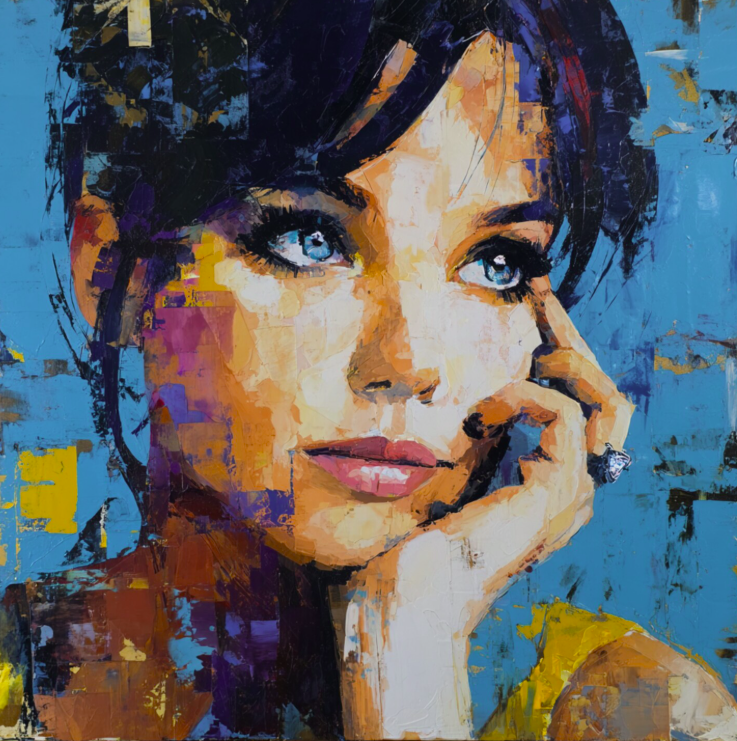 “This work was created using a mixed-media technique with acrylic on canvas. The use of different materials and techniques creates a unique texture and depth that lends the image a vibrant dynamic. The color scheme can vary depending on the incidence of light and interpretation, revealing new facets to the artwork time and time again. Each nuance, each layer tells its own story and invites the viewer to immerse themselves in the composition.”