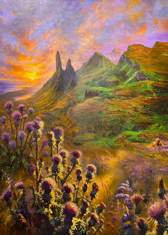 “This painting bursts with the fiery energy of a Scottish twilight, where rugged peaks meet soft, glowing skies. I poured my passion into capturing the thistles’ wild beauty, glowing with the last light of day. It radiates warmth and strength, filling your space with a vibrant, serene connection to nature’s untamed spirit and the timeless Scottish landscape’s soul.”