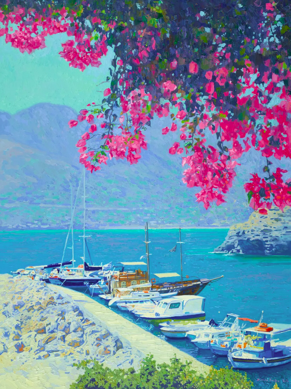 “Through the branches of Bougainvillea. Through vibrant pinks cascading like joyous laughter, I captured a serene harbor’s embrace. Using oil with impressionist touches, I wanted to evoke the gentle warmth of sunlit moments and the calm whispers of the sea. This piece radiates peaceful energy, inviting your space to bloom with lively tranquility and a breath of coastal dreams.