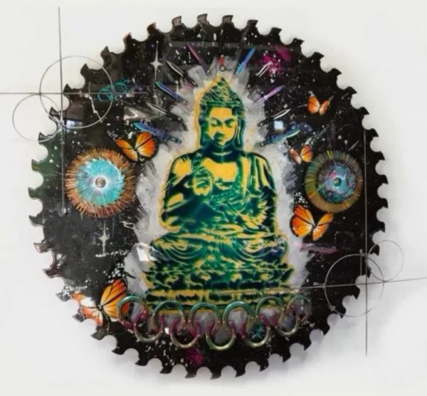 Acrylic, Aerosol, Kandy Car Paint, Crushed Abalone with Horse shoes and knife blades on Antique Saw Blade