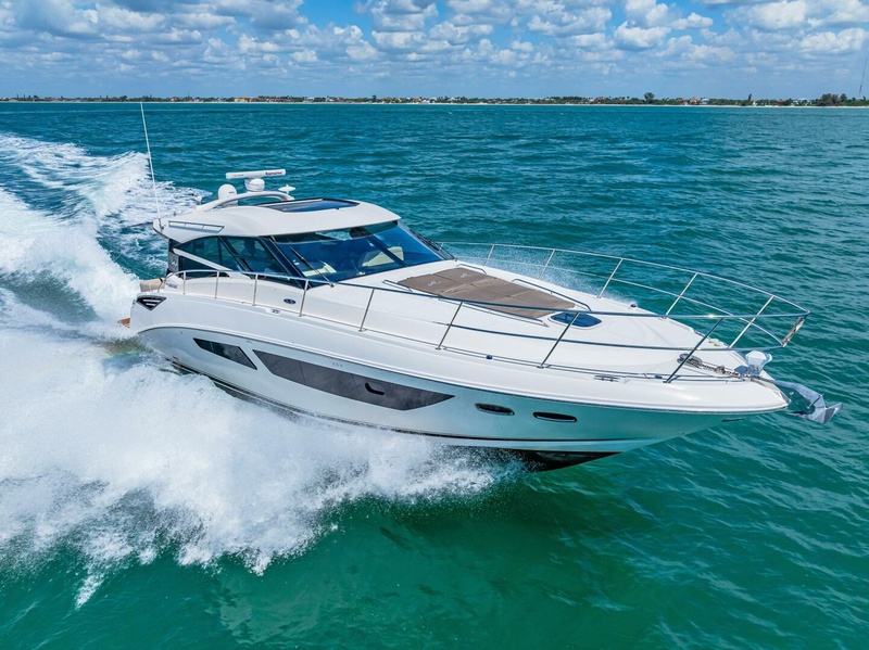 Below deck, the cabin is a haven of comfort and style. The rich, warm wood finishes and plush furnishings create an inviting atmosphere, perfect for entertaining or simply unwinding after a day at sea. The galley is equipped with modern appliances, ready for you to prepare gourmet meals. The 470 Sea Ray Sundancer boasts a tastefully luxurious two-head, two-stateroom layout that I believe will impress even the most experienced multiboat owners. The 470 Sundancer’s performance is as impressive as its appearance. Powered by twin Cummins engines, it glides through the water with ease, promising an exhilarating experience for the captain and guests alike. With is twin Cummins 480hp engines the 470 Sundancer can cruise comfortably at 27 knots burning around 34 gal/per hour combined and top speed is right around 33 knots.