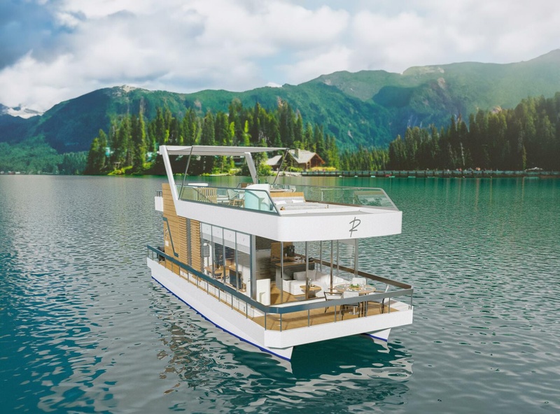 The Reina Live L44 DR is one of two models of Reina Live. It is the largest and most luxurious model we offer, with lots of room and functionality both for permanent liveaboard cruisers and for entertainers who want to bring people on their boat to party and enjoy themselves in nature. The L44 DR is 44 feet long, with a foredeck, living area, dining area, full kitchen, 1 bathroom, and 2 cabins. A circular staircase connects to the expansive second-story deck with hardwood floors and glass safety railings. If you want all of the comfort and luxury of an expensive apartment with the mobility and adventure of life on the water, Reina Live has everything you need.