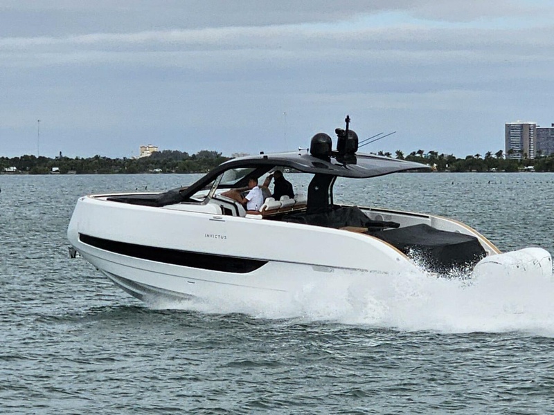 USA DEBUT!! The Invictus TT420S is the ultimate in day boat luxury cruising. Equipped with the following standard options this boat offers everything you need for a day out on the water or the getaway to the islands. The Invictus features a two cabin layout with teak on the swim platform, in the cockpit, along the side walkways and on the gunwhales. It has a carbon fiber hardtop, 2 expandable teak cockpit tables, stand-up cabinet storage, compass, fusion stereo system with 6 speakers, hot water heater, aft and bow showers, bow thruster and windlass.