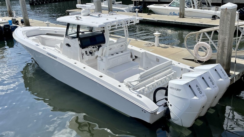 2023 Fountain 38 CC Triple Mercury 400M Verado’s. White Engine Pkg. DTS Controls. Reverso Automatic Engine Flushing System. 380 K-Plane Hydraulic Trim Tabs. Bow Thruster. Thru Hull Anchor Windlass/Rode Kit, Striker Plate, Polished SS Plow, 15’ of 5/16″” Galvanized Chain, 150’ of 5/8″” 8-Strand Braided Rope. Starboard Side Cockpit Dive Door w/ Ladder. Gemlux BA-12 Outrigger Bases (2). Gemlux 18’ Deluxe Collapsible Hybrid Outrigger Poles. 30 Gal. Livewell. (2) Aft & (2) Amidship Electric Reel Outlets. Garmin 54W Open Array Radar. Garmin Full Function Hydraulic Autopilot. B175H Transducer Upgrade. Dual Garmin GPSmap 8616 16″ Displays. Mercury VesselView 903 Display. Additional USB On Dash & Inside Topper Glovebox. Stainless Steel Wheel w/ “Speed Knob”. Windshield Wiper. Premium JL Audio System w/ Fusion RA770 Touch Screen Entertainment Center w/ Built In WiFi, (6) 7.7 RGB Spkrs, (2) 8.8 RGB Spkrs., (2) 10″ RGB Subs, 800W 8 Ch Amp & 400W Mono Block Amp. XM Radio Ready Option. FWD Cockpit Sailshade. Transom Seat w/ Upholstered Seat Bottom & Removable Backrest. Enclosed Head w/ Ceramic Toilet, Overboard Discharge, Fresh/Raw Water Holding Tank. Port Light. Fresh & Raw Water Washdowns. Transom Shower. Dash & Helm Seat Covers. New trailer quotes available separate. Financing and insurance options also available, all 2005 and newer model year trades considered. Call for special dealer pricing and demo scheduling.