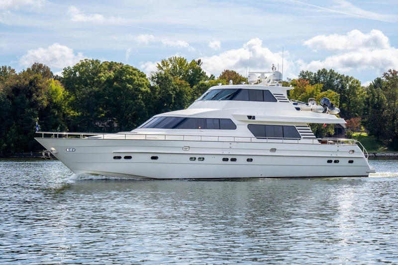 New to the market is a beautiful 82′ Horizon with a command bridge, a total of (5) staterooms, a spacious salon, gourmet galley, and large dinette. The hi-gloss teak and cherry wood interior with burl accents are stunning and the décor is welcoming.