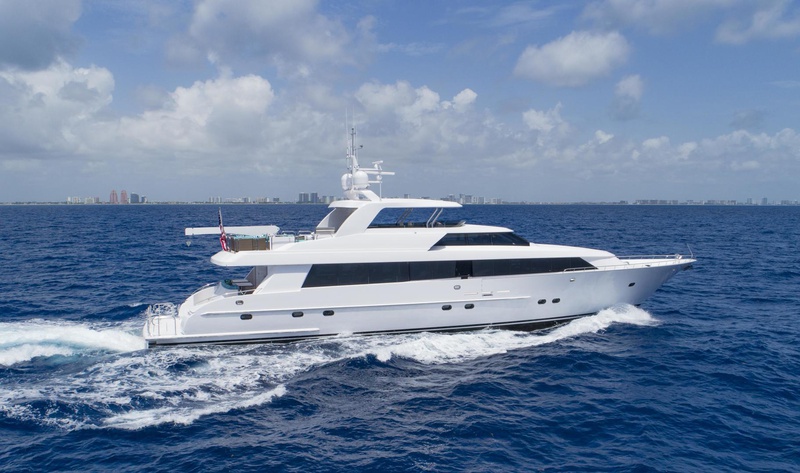No Name 120′ is a spectacular yacht with an extensive refit that occurred in 2021-2022, taking over 12 months and close to $2M invested in her. She underwent a complete paint job, top to bottom, with 2 coats of Awlgrip Total Prime 545 and 3 topcoats of Awlcraft 2000 Snow White at the prestigious Roscioli Yachting Center in Fort Lauderdale, FL.
