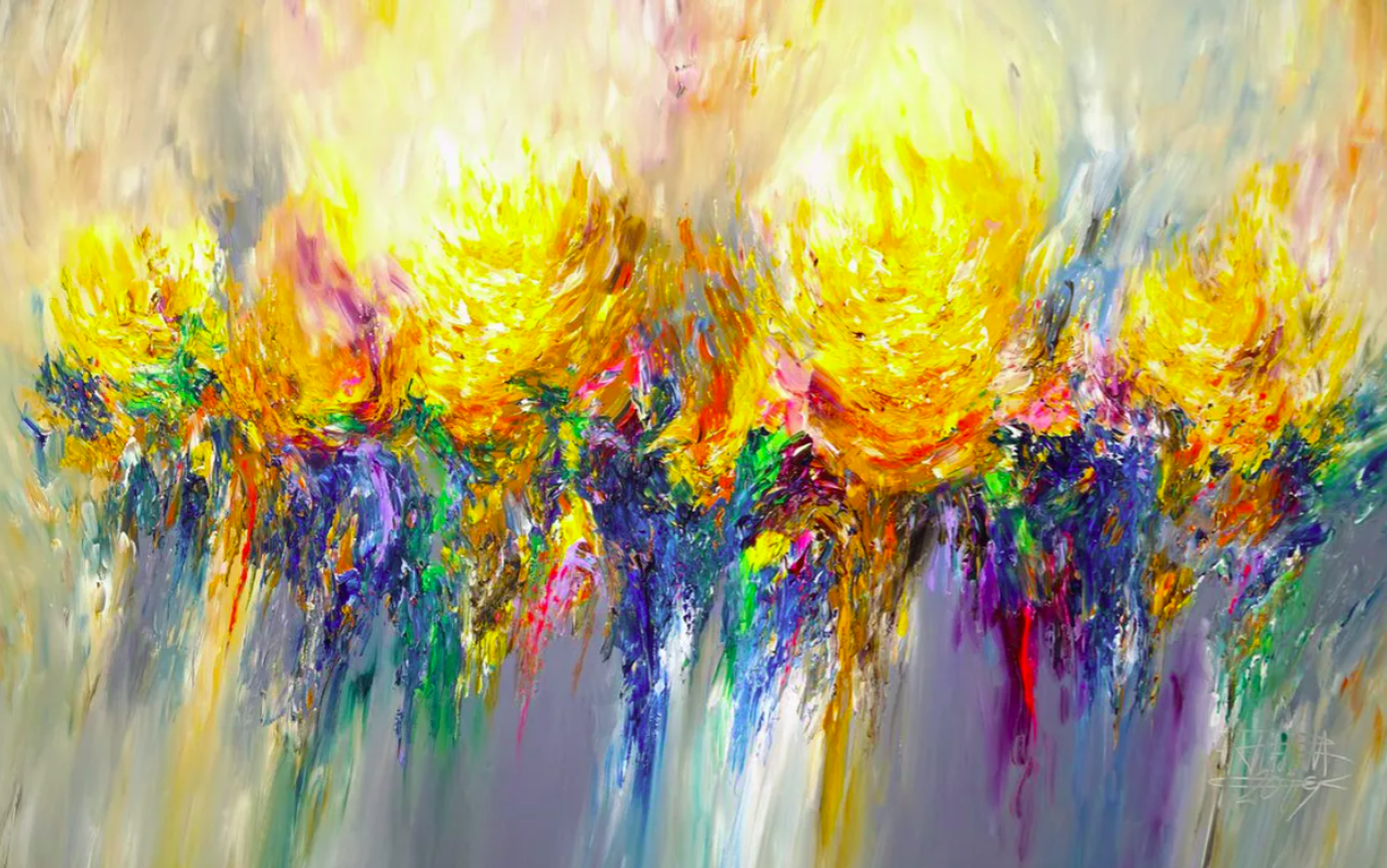 An astract, yellow-colored painting in extreme XXXL format, which exudes vitality, positive energy and dynamism. An attractive composition created using my own unique mixing technique with brush and spatula; around the four beaming yellow, upward-oriented formations are detailed and highly contrasting red, orange, magenta, pink, blue, green, purple, beige, brown and white shades. Because of its size, it is particularly suitable for large rooms with high walls.