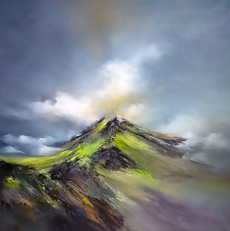 “This painting beautifully captures the essence of a rugged mountain peak surrounded by a moody, ethereal atmosphere. The mountain stands tall in the center, its slopes rendered with rich greens and dark shadows, suggesting both a mix of grassy and rocky textures. There’s a dynamic contrast between the sharp lines of the mountain and the soft, misty clouds that seem to wrap around it, evoking a sense of isolation and grandeur. The sky is painted in cool, muted tones of blue and gray, blending seamlessly into the mist that gathers around the peak. The lighting appears diffuse, hinting at either an early morning or late afternoon scene, where the sunlight is hidden behind the clouds, casting an even, soft glow over the landscape. Overall, the painting conveys a peaceful, yet dramatic atmosphere, with a focus on natural beauty and the sublime power of the mountains. The smooth transitions between the clouds and sky give it a dreamlike quality, as if the mountain is emerging from or disappearing into the mist. It’s both calming and awe-inspiring!”