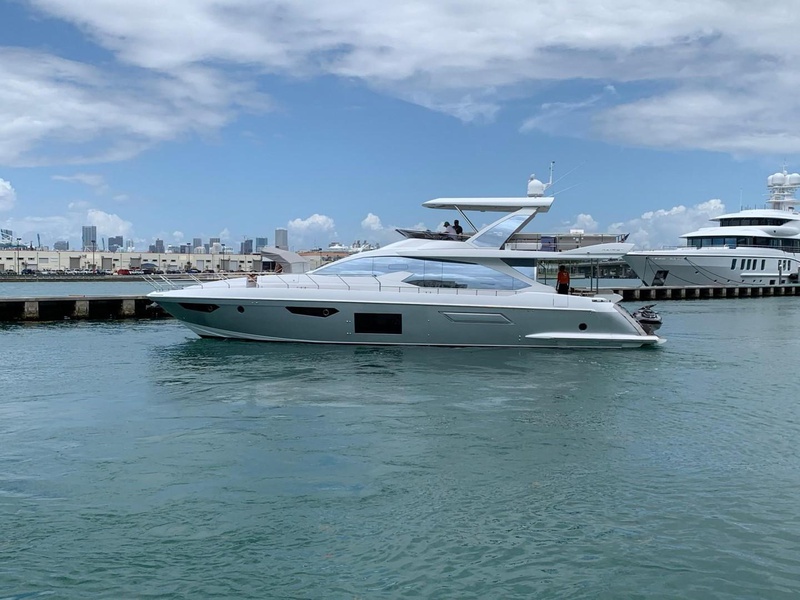 Fully equipped with Gyro Stabilizer, joystick driving, flybridge grill and stove, swimming platform with jet ski chocks, hydraulic gangway, bow and stern thruster, washer and dryer, dishwasher, Miele appliances, metallic hull painting (Miami Silver).