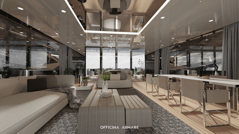 BADGAL is a sleek and elegant 43-meter concept curated by Officina Armare Yacht Design Studio. The exterior design is unique, featuring a high sheer line connecting the bow to the stern. The glass-domed upper deck adds to the sporty look while the dark colors create an air of mystery. The bow mooring equipment placement under the upper deck flooring results in an innovative solution to storage and guest space ratios. Additional space is created in the lower deck by the v-drive transmission configuration, reducing the engine room area.