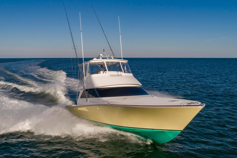 The Viking 52 is extremely popular because of it’s manageable size but also, it’s capabilities. The 52′ has a 17’5 beam and its interior boasts a large salon as well as three staterooms and two heads. This interior volume is designed into a hull that has sharp entry and flare for the ride and semi prop pockets to reduce draft. When it comes to performance the “Catch This” will cruise easily at 28-30 kts, and holds an astounding 1400 gallons. Give us a call to get further details or schedule a viewing.