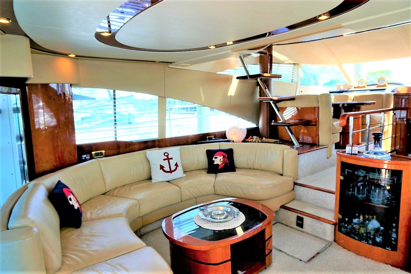 This 2003 Fairline 58 Squadron, Cat’s A Nova, combines luxury, performance and practicality. Through-hull anchoring and expansive stowage keeps decks safe and tidy. Large oval flybridge with asymmetrical design makes it ideal for socializing. As you curve around the front of the helm, positioned centrally, you will notice the large, upholstered semicircular sunbed. Behind the helm is a large settee with an adjustable table that will convert into a sunbathing area. There is a bar, with sink, ice maker, refrigerator and electric griddle and twin bimini tops.