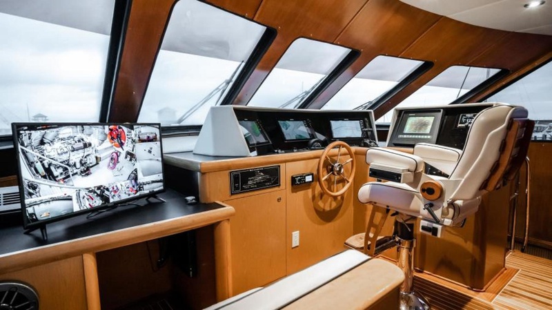 “Come Monday” has an exceptionally tasteful and neutral interior. Custom-built maple hardwood millwork package graces every inch. New gray white-washed floors have been installed up to the transition into the galley. You can enter the Salon two ways. Primary access is from the aft via a large glass electric sliding door. The second is on the starboard side water-tight door. Stepping in from the aft yields a wide-open salon and dining room.