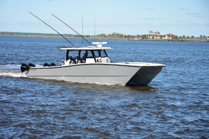 2023 47 Freeman 47T Boat FINNIKKI for sale. CARBON FIBER HULL – STARLINK equipped – Quad 300 mercury engines. 3 rows of seating. Engines are under warranty through APRIL of 2026. Better fuel mileage still cruises in the mid-40s and top end around 60mph. Can run on 3 engines with a full load if necessary. Captain maintained with an open checkbook. Haze Grey, Electric slideout Grill, Dekit, Hooker pump system, Marsh Tacky Outriggers, Dual Dive doors, 24″ Simrad screens. FLIR. The owner’s third 47 is on the way so need to get this one off the lift.