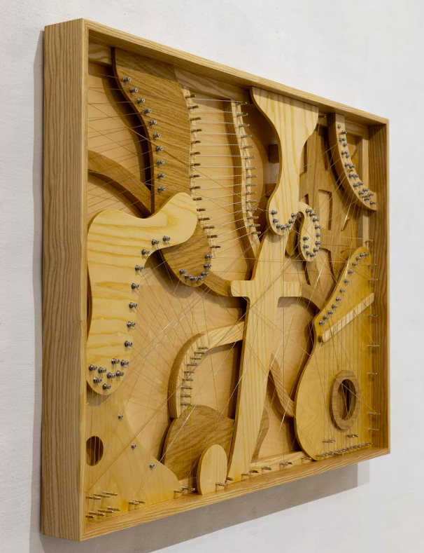 In these complex wall sculptures, various wood pieces coexist with numerous overlapping strings, creating ‘abstract’ 3D paintings/reliefs that refer to musical instruments and musical symbols. I have created musical instruments and sound sculptures in the past, which are kinetic or interactive. However, this time I try to represent sound and musicality only visually, in works that are static, not interactive, and silent, but can still reveal all the dynamics and tensions present in music. Different types of strings have been used (steel, brass, etc.) which refer to various musical instruments, but now acting as visual ‘line’ elements, that Koutsouris uses to ‘paint’ on his ‘wooden canvas’.