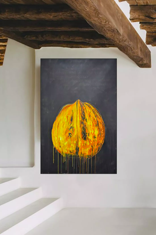 “A giant nut on a black ground full with poetic words taken from the “destiny of all seeds”… a poem by K. Gibran”
