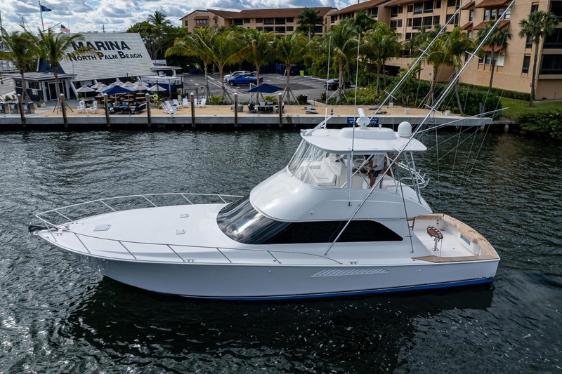 “Off Ice” features Garmin and Furuno electronics, granite counter tops, a high gloss teak interior, factory installed mezzanine cockpit seating with freezer, refrigerated drink box, Eskimo ice machine, watermaker, KVH SAT TV, Viking premier decor package. Boat has ideal (3) stateroom, 2 head layout- (Bow bunk configuration is 60/40). “Off Ice” has been immaculately maintained by a professional full-time Captain. Boat has no gelcoat crazing or milky wood panels.