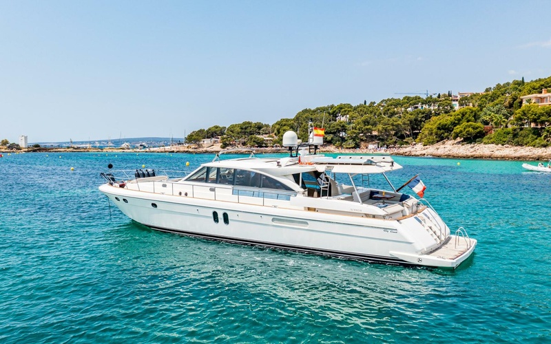 This Guy Coach 2100 Open of 2004 is in immaculate condition and offers incredible comfort for her owner and guests. She boasts expansive deck spaces, with comfortable lounging spaces on the after deck, including cushioned seating, sunbeds, a dining table, and a hard top cover for shade from the sun if desired. Her bow area is the perfect relaxation space, including two sunbeds with a bimini top if shade is desired, as well as a spacious, forward-facing sofa ideal for sundowners.