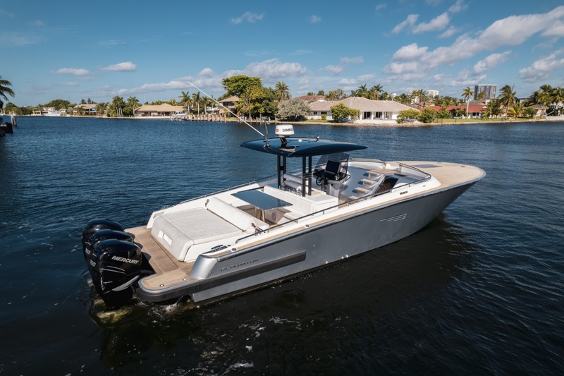 When it comes to high end day cruisers or tender for your super yacht, the 2018 Canados Gladiator 428 fits the script perfectly. Powered by triple 350 Mercury Verados engines. “SALVAJE” is fast and dry and will take you anywhere in the utmost comfort. The ride is surely the softest you’ve ever experienced. The outdoor space is ideal for entertaining family and friends with ample lounging room. Making your way inside the Canados Gladiator 428 you’ll find that the 13 foot 9 inch beam creates a wide comfortable space allowing for a good night sleep or a comfy afternoon nap. The head is very spacious and allows for comfortably when having to use the bathroom. Through out the aft deck you will find hatches and storage area for life jackets, and toys.