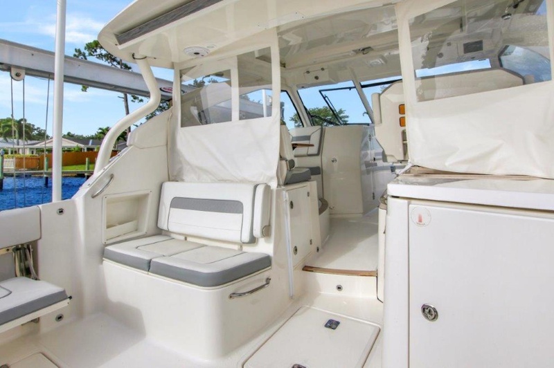 This lift kept 2021 Pursuit Dual Console 365 has been cared for with no expense spared. Forward bow and side lounge seating, a swivel helm seat and fold away seating at the transom and under the gunwale gives your crew a comfortable place to enjoy whatever type of water activities you choose.