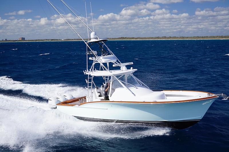 This 38 Caison packs big boat attitude and amenities in a smaller package. From the Carolina Flare to the fast smooth ride and everything in-between. She has a lot of the same features as her bigger counterparts like the SK5, to eliminate much of the roll, the Eskimo Ice Machine to provide you with plenty of ice throughout the day, all the way up to the tower to help you keep an eye over your bait spread. Anglers can also relax on the rear facing mezzanine seating while on watch. Ample storage in well thought out areas around the vessel, and to finish it all off, a beautiful teak package complete with covering and combing boards.