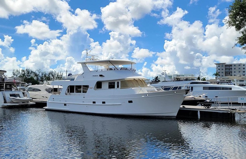 TASMAN was originally delivered to Seattle, WA, to a New Zealand client with over 50 years of cruising and sailing experience. His background included the ownership of a boat yard in New Zealand, where his team constructed an 86’ world cruising long-range vessel. After TASMAN changed ownership, she was kept in the northwest for a period of time by her second owners. TASMAN’s current owners dedicated substantial funds to adding a Seakeeper system, extended freezer and refrigeration, a voltage and cycles converter, and additional systems and cabinetry changes from the original design. These owners have cruised TASMAN extensively, and even shipped the yacht to Europe and cruised there. The yacht spent the last year in Grenada, until her recent arrival in Fort Lauderdale – a 1,500 nautical mile voyage.