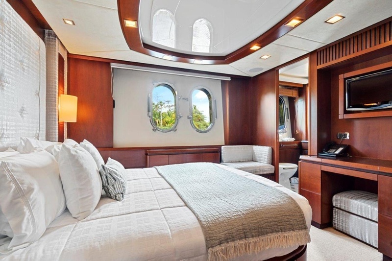 • The on-deck master is elegantly decorated and finished, benefitting from large windows to allow lots of natural light due to its position on the main deck. Besides a king sized bed, this living area also affords the owner a nice desk to work and a comfortable settee to relax. There is a beautiful, full beam master bath that is finished with a number of different marbles and has a shower, bath, and toilet.