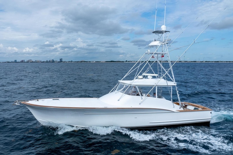 The Wildcatter is fully serviced in turnkey condition for her next owner to enjoy. This high quality Custom Carolina is a jig built with a traditional cold molded triple layer Okumi hull providing a soft dry ride cruising at 28 kts, 52 GPH and amazing sea keeping ability in any sea condition. The spacious cabin, full teak designer interior, two roomy staterooms with two full heads and nicely appointed galley are just some of the exceptional features.