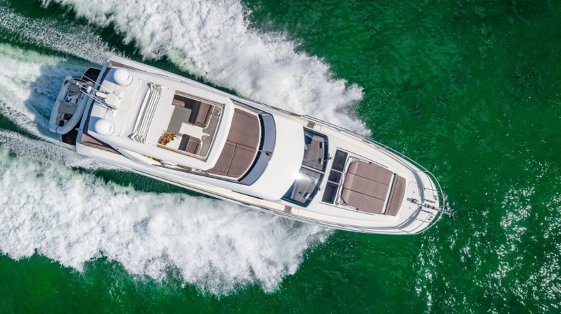 This Prestige is designed with a large open main floor salon, aft galley, large windows and open views. With 4 staterooms, expansive master cabin skylights and comfortable walk-in closets, she comfortable sleeps up to 8 guest. Each stateroom is opulently appointed fine fabrics and textures, and a notable heightened level to fit and finish that is unparalleled in the industry.  The 68 Prestige perfectly blends indoor and outdoor living with a large outdoor aft sitting area and an expansive flybridge that includes unique forward sun pads. Powered by Volvo Penta IPS 1200 engines, Cummins Onan generator. Seakeeper gyro stabilization.