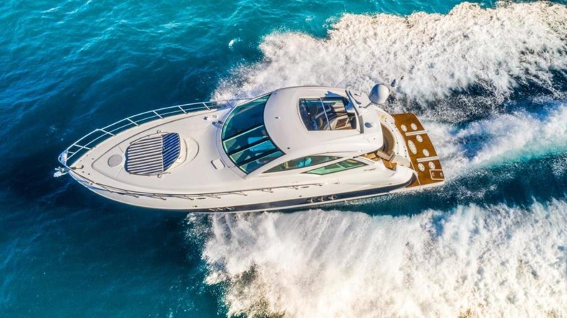 Triple IPS 600 Engines with only 350 hours. She has Joy stick controls and has a reported top end speed of 41.5 mph. Cruising speeds are very comfortable and fuel efficient around 30 mph. Loaded with twin 12″ Raymarine Hybrid Touch screens, Open Array Radar, Autopilot, Cockpit A/C and Heat, Custom Painted Blue Imron Hull, Retractable Hardtop with sun shade, Foredeck Chaise Lounge, Electric Helm Seat, Washer/Dryer Combo, Polished Stainless Anchor with Wash down System, Amtico Walnut Salon Flooring and Opening Aft Stateroom Portholes. Walk thru windshield to bow makes throwing a dock line or sunbathing easier and safer. Large extended hydraulic swim platform allows for a larger tender and more space for anchoring out activities. Transom seat with cup holders. Aft cockpit bench seating coverts to a larger sofa so more guest can be seated at the large cockpit table. Owners full beam master stateroom midship with walk-around bed. 50-amp Glendinning power cord makes connecting power to the boat easy.